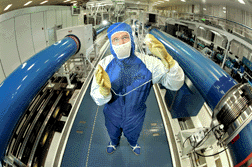 SURROUNDED BY Z-BEAMLET Sandia technologist Benjamin Thurston examines the debris shield that protects the giant Z-Beamlet lasers final focusing lens from flying debris when the Z accelerator fires. The lens is square because the beam generates an approximately 12-inch-square footprint, like a kind of flying pancake, until focused down to approximately 100 microns.