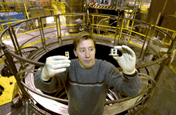 PENNIES FOR THE TOLLWAY? Sandia researcher Mark Knudson holds two flyer plates in his right hand and chambers of his high-tech gun in his left. In the background is the innermost sanctum of Sandias Z accelerator, where a rapidly expanding magnetic field drives pellets faster than any mechanism on earth. (Photo by Randy Montoya)