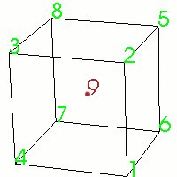 Figure 2 is an example of using the tetmesh respect command to enforce a node at the center of a cube. Node 9 in this example was generated by first creating a free vertex at the center location and meshing the vertex. (mesh vertex 9). The following commands would then be used to generate the tetmesh that respected node 9.