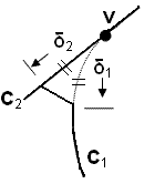 Curves are not specified for this option. Instead, Cubit will automatically identify the smallest angle at the vertex and collapse it using the tangent option described below (see Figure 4). An optional angle option may also be specified that controls the arc length (δ1) along curve C1 where the curve will be split. If not specified a value of 30 degrees will be used. For the simple option of this command, a range of vertices may be used. The complete version of the command requires exactly one vertex and two curves.