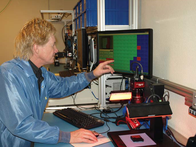 We’ve built a machinevision recognition system for fast, error-free parts handling in support of a defect-prevention strategy for our small form-factor HBT — heterojunction bipolar transistor — products. The system removes the human operator from multiple data entry steps from package lidding to final package delivery. Human data entry now occurs only once in the product’s life. The reading system uses high-resolution camera software to recognize each part in an image of an array of parts to enable our software system to interface seamlessly within an electronic production control system framework. (1700) NW [NW]
