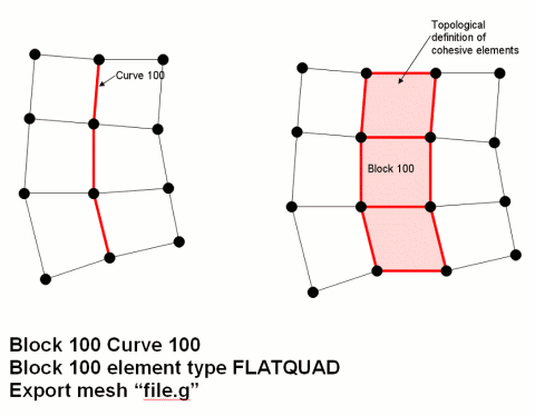 Cubit supports 2D cohesive regions. Cohesive elements are implemented in Cubit as element blocks with an element type of FLATQUAD. The cohesive region is identified by assigning geometric curves to the FLATQUAD element block. When the element block is exported, each edge on the specified curves is represented in the exported file as a 4-noded quadrilateral element with zero area. The quadrilateral element is formed by duplicating each node in the original edge and then connecting the two original and two duplicate nodes to form a zero-area quadrilateral.