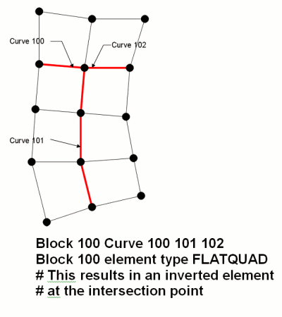 Although multiple curves may be assigned to a single cohesive block, the curves assigned to a block of type FLATQUAD must not branch. A branch occurs whenever three or more curves share a common vertex, as shown in the figure below.