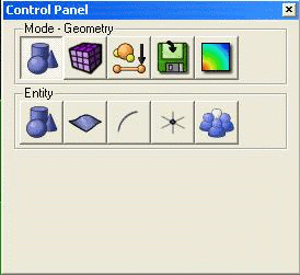 The Command Panel is arranged first by mode on the top row of buttons. Modes are arranged by task. All of the geometry related tasks, for instance, can be found under the Geometry mode. When a mode is selected, a second row of buttons becomes available. The second row of buttons shown depends on the selected mode. For example, if Geometry, Meshing, or Materials and BCs is selected, the second button row will show entity types. Entities are those specific to the mode.