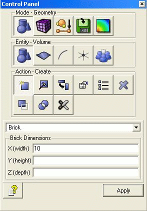 All command panels are constructed similarly. Each abstracts a set of Cubit commands. Options are selected using checkboxes, radio buttons, combo boxes, edit fields, and other standard GUI widgets. Each command panel includes an Apply button. Pressing the Apply button will generate a command to Cubit. Nothing happens until and unless the Apply button is pressed.
