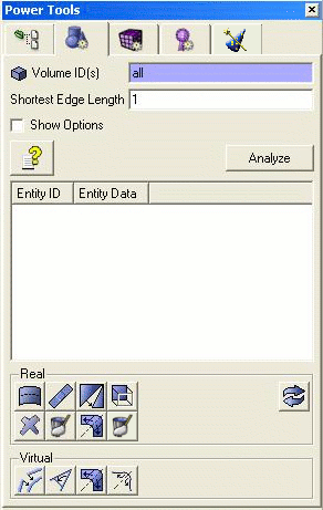 The geometry power tools are located on the Tree View window under the blue geometry tab. In many cases, a model will fail to mesh because of problems with the geometry. Since the range of geometry problems is so wide, and because these problems can be hard to diagnose, the Geometry Power Tool has several built-in tools designed to analyze and repair these problems. The Geometry Repair Tool analyzes geometry for small angles, overlap, small features, bad geometry definition, blend surfaces, close loops, or mergeable entities that may affect meshing capability. It also contains a powerful toolkit of geometry modification methods to fix these problems. All of the common geometry clean-up tools are now in one place on the GUI menu. In addition, there is a window that lists results from geometry analysis in a tree format, making it easier to find, diagnose, and solve geometry problems. And Cubit will save your settings, so you can run the same diagnostic tests each time you use the geometry power tools.