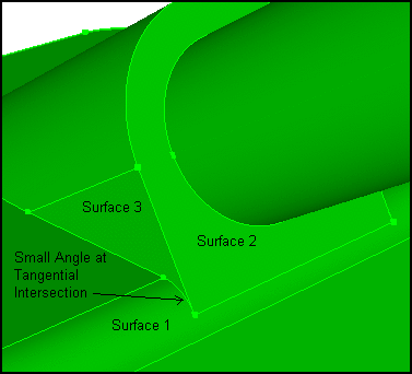 Tangential Intersection - A tangential intersection is formed when two parallel surfaces share an edge and have a 180 degree angle between them. The tangential intersection test is looking for the condition where two surfaces that meet tangentially share a common edge, and each of the surfaces has another edge which resides on a third face and forms a small angle as shown in the following example. Surface 1 and Surface 2 are tangential to each other and share a common edge. Both Surface 1 and 2 have another edge which resides on Surface 3 and forms a small angle at the vertex common to all three surfaces.