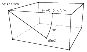 Any location can be "swung" (rotated) about an axis by a certain angle. (See the section on specifying an axis for the axis syntax). As with moves, multiple swings can be strung together. The following example rotates the location (2.5, 5, 5) thirty degrees about an axis defined by Curve 11. Note that the right-hand rule is used to determine the direction of the swing about the axis.