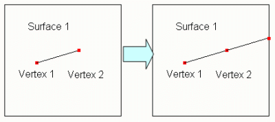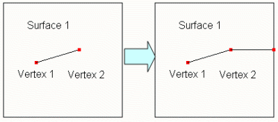 This command splits a surface by extending a surface hard-line until it hits a surface boundary. Figure 4 shows a simple example of extending a curve. The hard-line curve was extended from the specified vertex until it hit the surface boundary.