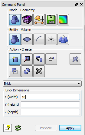 All of these geometry creation commands have been expressed in the GUI's command panels. To navigate to the volume creation command panels, for example, select "Mode-Geometry", then "Entity-Volume", then "Action-Create", as shown below. Other geometry creation command panels are available for each geometry type.