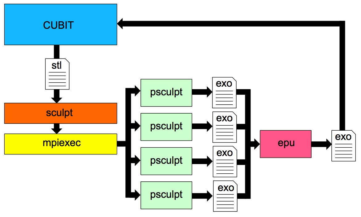 For the Sculpt meshing process, a set of files, including a facet-based stl file are written to disk. The sculpt application is then started up which in turn invokes mpiexec to start up multiple instances of psculpt in parallel. psculpt then performs the meshing and writes one exodus file per processor. These files can then be combined using epu and then imported back into Cubit for viewing.