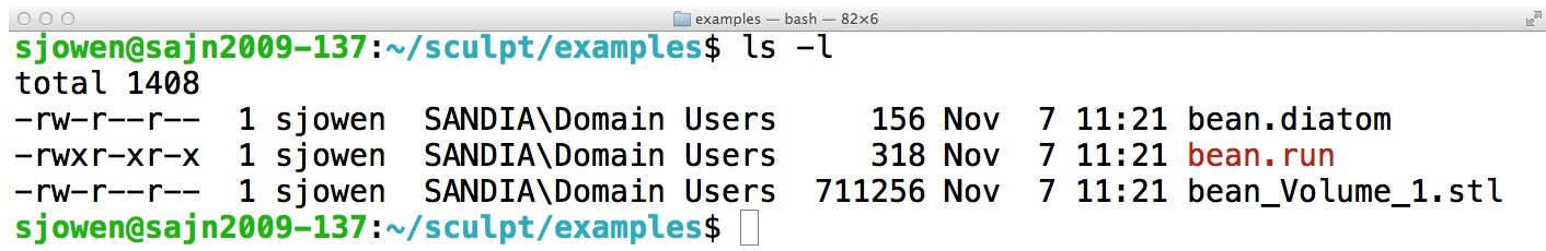 In this case, we used the no_execute option which does not invoke the Sculpt application. Instead it will write a series of files to the working directory. The fileroot option defines the base file name for the files that will be written; in this case "bean". We also use the processors option to set the number of processors to be used to 8.