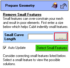 - Click on the button with three dots (...) next to the small curve length input box. This will open the small feature size panel. The small feature size panel is a tool to help the user find an appropriate small feature size. The smallest feature size is the smallest detail in the model that needs to be resolved in the mesh. It is also used for several calculations and diagnostic tools in the geometry ITEM panels. Any feature that is smaller than the smallest feature size will be flagged as a small curve or surface, and will need to be removed.