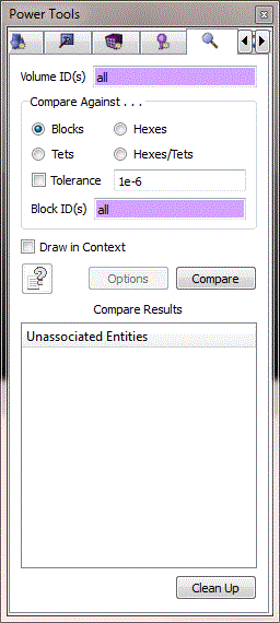 The user selects the volumes for the comparison, then selects the mesh entities for the comparison. A default comparison tolerance value of 1e-6 will be used unless otherwise specified. No additional setup is required. Select the "Compare" button to generate results.
