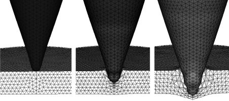 Figure 5 shows an example of using Mesh-Based Geometry for a large deformation analysis. In this case, the analysis [Attaway et. al.,98] began and continued until mesh quality became unacceptable. At that point, the mesh was imported into Cubit and geometry re-created from the computed deformations. The finite element mesh could then be removed, remeshed or improved and written back to an Exodus II file. After remapping [Wellman,99] the appropriate analysis variables back to the mesh, the analysis could then be restarted. This process was repeated multiple times until the desired results were achieved.