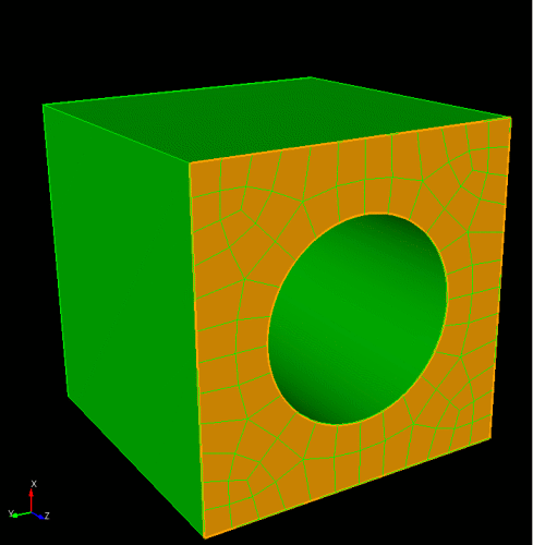 Now all necessary intervals have been set, the meshing can proceed. Begin by meshing the front surface (with the hole) using the paving algorithm. This is done in two steps. First, set the scheme for that surface to Pave, then issue the command to Mesh.