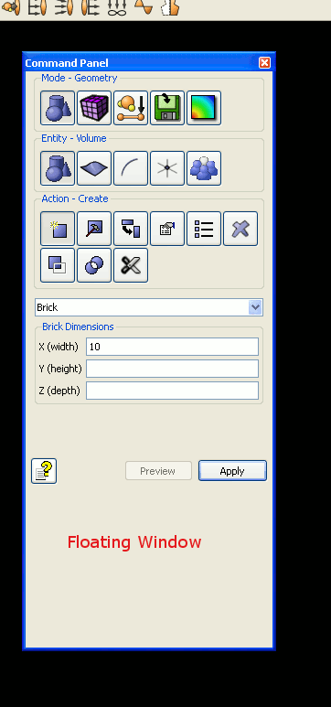 Command Panel - Most Cubit commands are available through the command panels. The panels are arranged topologically, by mode.