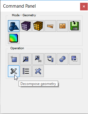 All of the geometry related tasks, for instance, can be found under the Geometry mode. When a mode is selected, a second row of buttons becomes available. The second row of buttons shown depends on the selected mode. For example, if Geometry is selected, the second row of buttons will contain operations that can be performed on geometry, such as creation, modification, decomposition, boolean, merging, deleting, and so forth.