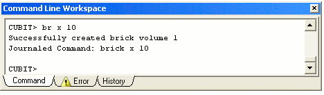 The command line workspace emulates the environment in the command line version of Cubit. Commands can be entered directly by typing at the CUBIT> prompt. This window also prints out error messages, informational messages, and journaled commands.