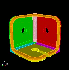 The collapse surface command is most useful in removing blended surfaces (i.e. fillets and chamfers) from a model. For example, Figure 1 below shows a set of highlighted surfaces on a bracket. By collapsing all these surfaces the model shown in Figure 2 is created. Collapsing the surfaces for this model simplifies the model and allows for the creation of a higher quality mesh.