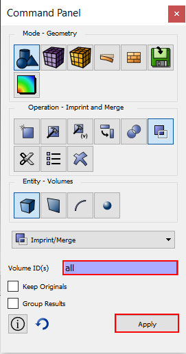 You will not notice any visible changes in the graphics window after imprint/merge operations, but results of the operations will be printed in the output window. Confirm that both surfaces have been merged by reading the output in the graphics window (You may have to scroll to see all of the results)