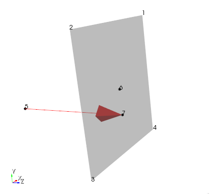 The Altitude quality metric for a single element is the minimum distance between the body center node and the projection of the body center node to the faces. Specifically, for a HEX27, the body center node is projected to each of the 6 faces of the element, and the minimum distance between the body center node and the 6 projections is the altitude metric for that element. The face projection is based on the linear approximation of the higher order face. The image below shows an example of the distance calculated when a body center node is projected to a face.