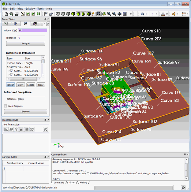 Step 1 requires specifying volume ids (e.g. all) and a tolerance (e.g. 0.6) as shown in Figure 1. Clicking “Analyze” button will automatically find small curves and surfaces in the volumes specified. Figure 2 shows the highlighted small curves and surfaces with the label information. Figure 3 shows a zoom view of a small surface.