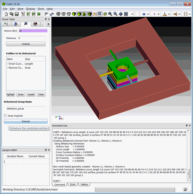 In Step 3 actual defeaturing is performed by clicking the “Execute” button (see Figure 5). Figure 4 shows the zoom view of a defeatured volume. Defeatured volumes are created in a new user specified group (by default in “defeature_group”) as shown in Figure 6. Only the volumes that have small curves and surfaces will be defeatured. Also, by default old original volumes are deleted and new defeatured volumes (child entities) will use the corresponding old ids. Please use the option “Keep Originals” if you want to have both old original and new defeatured volumes.