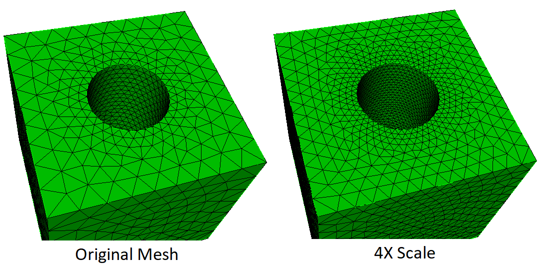 Mesh Scaling is useful for solution verification, as it can easily generate a series of similar meshes of increasing mesh density. For best results, generate each mesh in the series by scaling the original mesh, rather than scaling the previous mesh of the series. It is suggested that each mesh uses a multiplier at least 2X larger, and a minimum at least one more, than the prior mesh. Small multipliers alone are unlikely to produce sufficient changes for solution verification. The minimum is especially useful for ensuring changes in regions that are initially coarse. A good set of (multiplier, minimum) parameters follows: