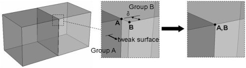 When pairs of vertices are found that are slightly out of tolerance, the current solution is to move one of the surfaces containing one vertex of the pair to another surface containing the other vertex in the pair. Moving or extending a surface is known as tweaking.