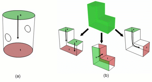 Figure 1. (a) ITEM displays the source and target of a geometry that is nearly sweepable. The region is not currently sweepable due to circular imprints on the side of the cylinder. (b) Alternative feasible sweep directions are also computed.