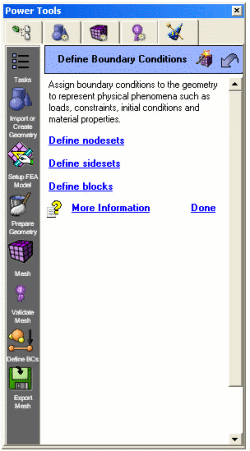 A few of the ITEM task panels will provide links to existing control panel topics. Clicking on a link from one of these panels will NOT open a new panel, but will open the corresponding control panel. The Define Boundary Conditions page is an example of this type of panel.