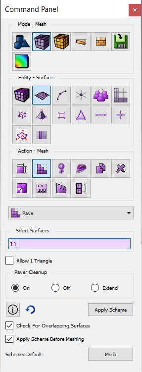 Now all necessary intervals have been set, the meshing can proceed. Begin by meshing the front surface (with the hole) using the paving algorithm. This is done in two steps. First, set the scheme for that surface to Pave, then issue the command to Mesh.