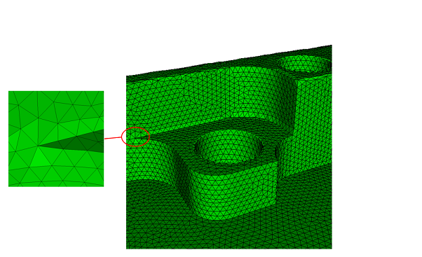 The images below show meshing a surface with and without setting a 'tiny edge length' value. In this example all surfaces have been composited into a single surface. Compositing small surfaces with larger neighbors in conjunction with using 'tiny edge length' has the effect of washing-over small features.