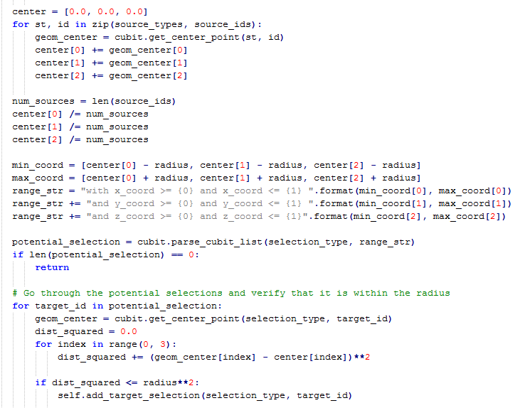 Selecting entities in the graphics window can sometimes be complicated. The Extended Selection Dialog leverages the combination of Python and the CubitInterface class to give users a very powerful mechanism for creating and managing custom selection filters.