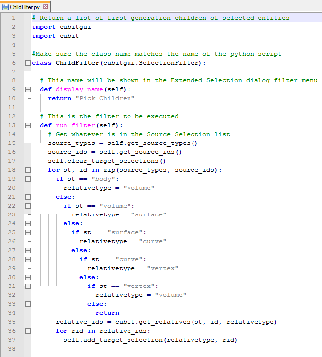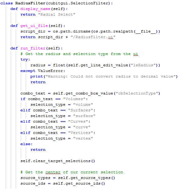 As mentioned above, the custom Python filters must implement a class and that class must be derived from the SelectionFilter class. The SelectionFilter class is available in the Cubit SDK. The SDK is available to any user.