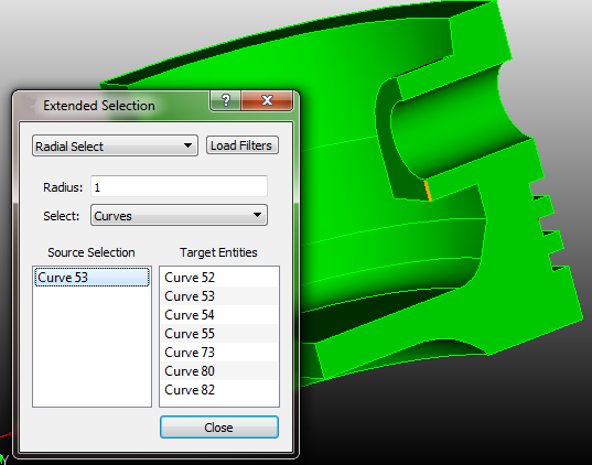 Notice two input fields: 1) a Line Edit to capture the desired selection radius and 2) a Combo Box that contains "Volumes", "Surfaces", "Curves", "Vertices" to specify the target entity selection type. The extended selection filter that contains this custom interface is shown below. The example shows a selection of all curves within 1 unit of the source selection.