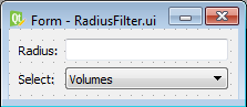 For example, if we wanted to create a selection filter that would select all entities of a certain type within a certain radius of a source entity, we would require a user interface that captures the desired radius and the desired entity type to be selected. An image of that user interface is shown below. The image was copied directly from Qt Designer.