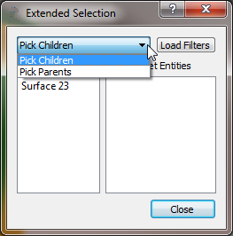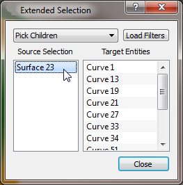 Use the pull down menu to select a filter. Click on an entity in the Source Selection list. Geometric entities that fit the filter criterion will be shown in the Target Entities list.