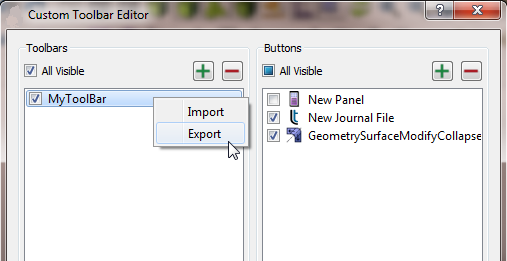 - Provide a file name to the Export Toolbars dialog. The file extension