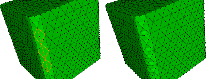 The tets are deleted and the two back sides become surface triangles. If the tets have mid-edge nodes, the back mid-edge nodes are snapped to the surface. If this removal operation generates worse quality (aspect ratio) than in the tet removed, the operation is not performed. Figure 2 shows before and after image of removing overconstrained tets.