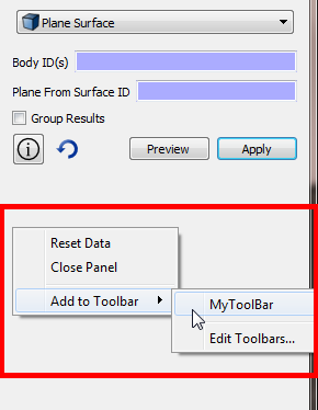 All command panels include a context menu which can be accessed by clicking on an empty place in the command panel and using the mouse to show the menu.