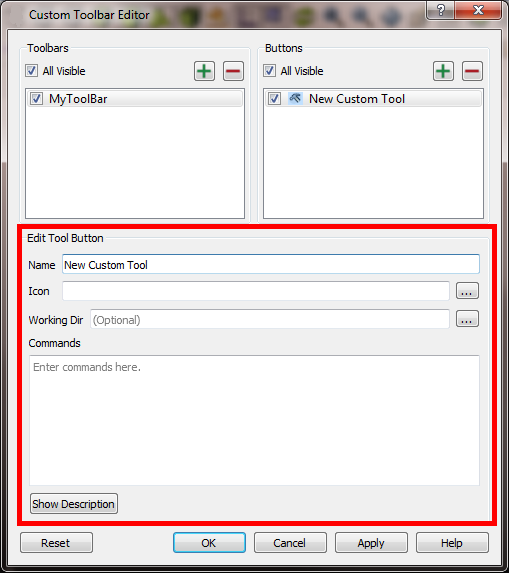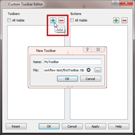 The new toolbar and buttons will be displayed as the last toolbar on the GUI. It is a docking window so it can be moved and placed anywhere on the GUI.