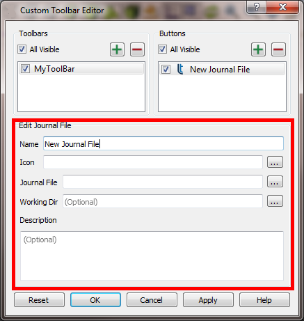 A Journal File Button will launch a journal file when pressed. The journal file may reside anywhere on the file system. A journal file button is defined by: