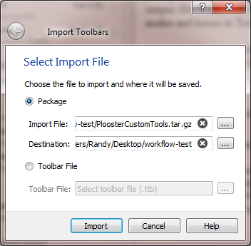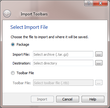 From this dialog a user may import an entire package containing multiple toolbars or a single toolbar. In this example we will import an entire package containing multiple toolbars.