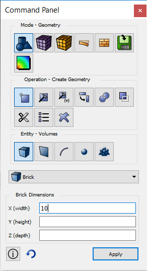 All of these geometry creation commands have been expressed in the GUI's command panels. To navigate to the volume creation command panels, for example, select "Mode-Geometry", then "Entity-Volume", then "Action-Create", as shown below. Other geometry creation command panels are available for each geometry type.