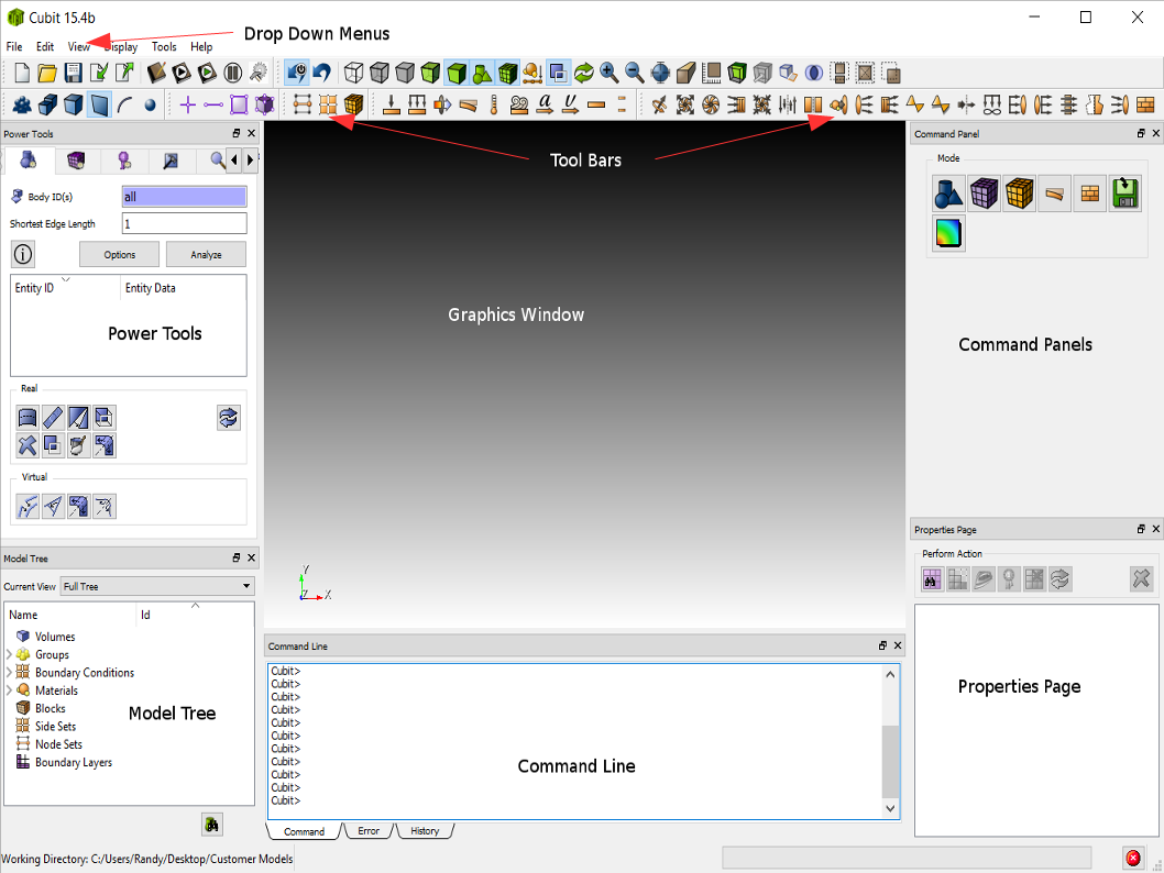 Type "cubit" from a UNIX prompt or select cubit from the start menu if you are running on a PC with Windows. The CUBIT Application Window will appear as illustrated below:
