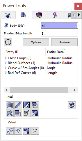 Many geometries that are imported from other solid modeling software contain inconsistencies or small gaps that can cause meshing to fail. These problems are the result of differences in tolerances, file transfer loss, or inherent limitations in the parent system. In other instances, the geometry has no inconsistencies, but may be unsuitable for meshing because of topology such as small angles, overlap, or features smaller than the desired meshing size. The geometry analysis tool will analyze the volumes and return a list of suspected problems. To see a list of analysis options, click the "Show Options" box below the Analyze button.