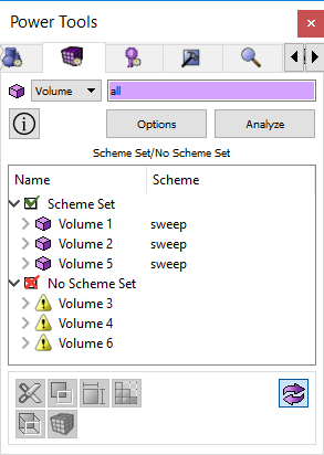 Output Tree - The output from the meshing tool is displayed in tree format. Geometry is divided into "Scheme Set" and "Scheme Not Set" divisions. The geometry is listed under these nodes. If autoscheme was successful, its assigned scheme is also displayed.