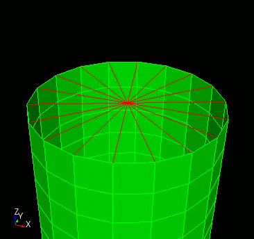 Some analysis codes refer to these bar elements as tied contacts or rigid bar elements. They can be used to tie models together or to enforce specific kinds of boundary conditions. For example, in the figure below a block of beam elements is used to tie a node at the center of the circle to every node on the edge of the circle. This arrangement can be used to enforce circularity but still allow for displacement of the entire circle. This may occur if there are additional structures above the cylinder that are being excluded from the current finite element model. The beam elements were created by a series of commands of the form